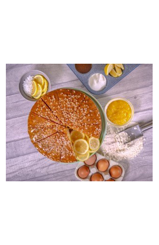 Lemon flavour sponge cake with lemon curd and lemon flavour frosting filling, topped with a lemon flavour drizzle and nibbed sugar
