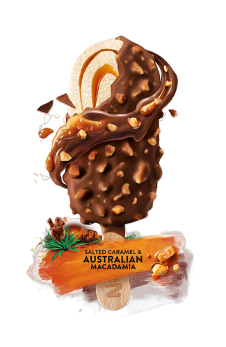 Vanilla ice cream swirled with salted caramel sauce (5,5%) covered with milk chocolate (32%) and caramelized Australian macadamia nuts pieces.