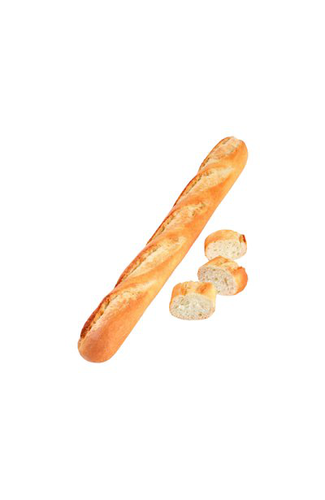A white, part baked baguette on average 540mm (approx. 21.1/4") in length. The product has 5 decorative top cuts and is supplied frozen for bake off by the customer.