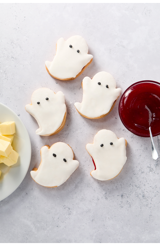 A generous helping of mixed fruit jam, sandwiched between two shortbread Ghost shaped biscuits, topped with a layer of Fondant Icing