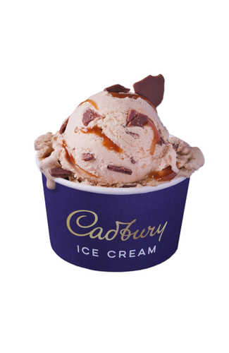 Caramel flavour ice cream with caramel sauce (15%) and Cadbury milk chocolate pieces (10%).