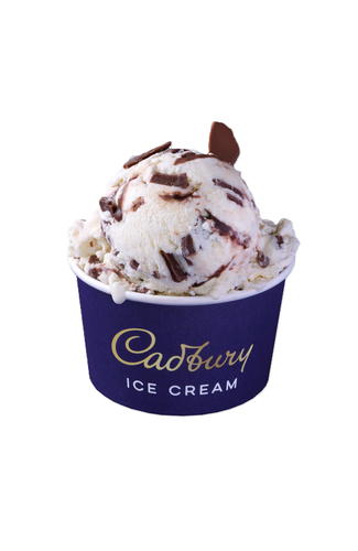 Vanilla ice cream with chocolate sauce (13%) and Cadbury milk chocolate pieces (10%).