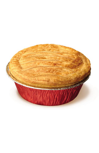 A ready baked round pie: Minced beef, chopped onions and dark gravy in a light puff pastry case.