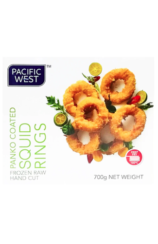 Raw, pre-fried squid rings coated in panko breadcrumbs