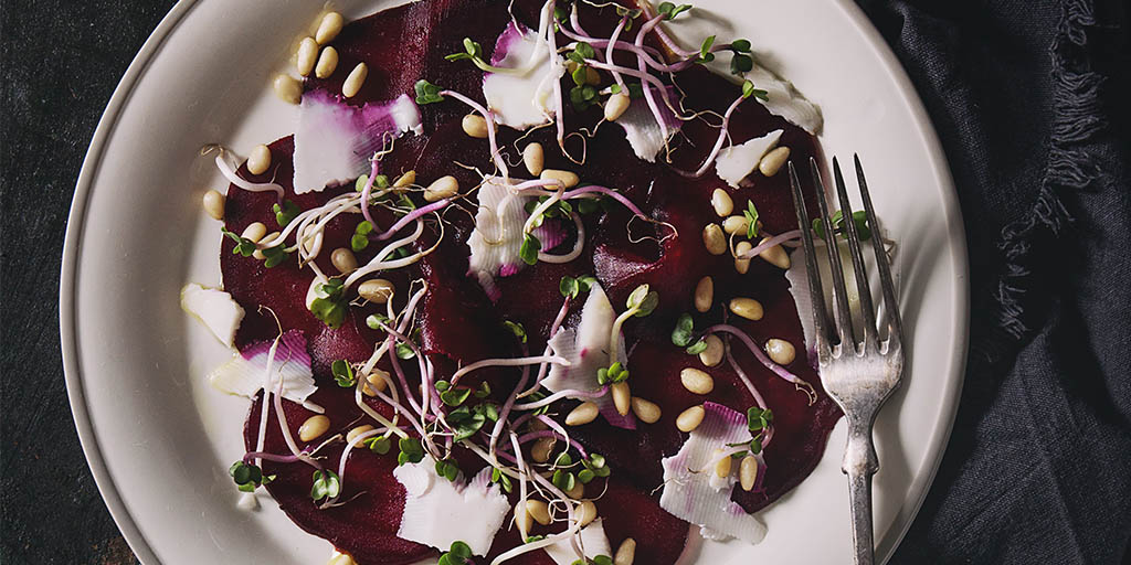 - Thinly slice the beetroot and lay on the serving plate.