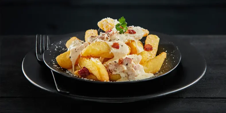 For a tasty twist on a carbonara, top with creamy parmesan sauce and bacon or, if you can get hold of it guanciale. Guanciale is bacon made out of pig’s cheek and is traditionally used in carbonara. Garnish the finished dish with parsley and black pepper.