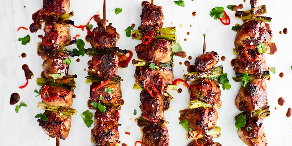 8. Once the chicken skewers are around 80% cooked, baste in the sauce and cook until caramelised.