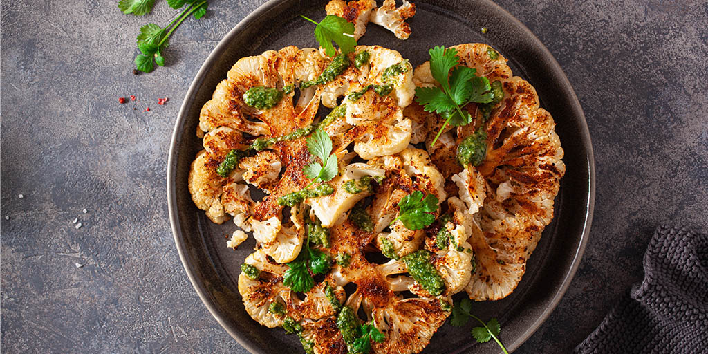 - Plate up the cauliflower steaks, drizzle with salsa verde and grate over a little lemon zest.