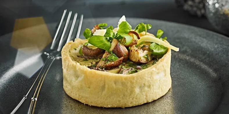 - While the pastry cooks, prepare your filling. Heat the oil in a pan and cook the mushrooms and garlic over a medium heat for five minutes or so, until they have released their liquid. Season well