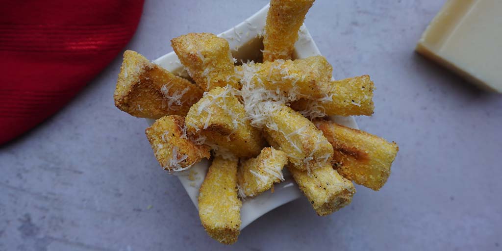 - In a bowl, combine the polenta and grated parmesan.